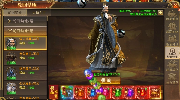 轮回禁地目前开放了多层,玩家需要在获得全部装备后,才能进入下一层挑战更强大的BOSS,获取更好的装备。BOSS掉落为随机机制,玩家可能需要多次挑战才能获得心仪的装备。