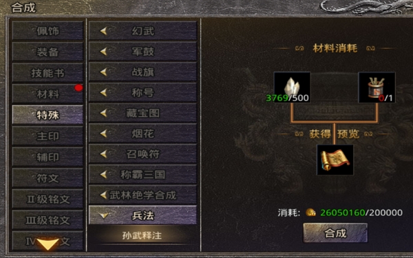 可刷兵书:“攻击兵书”“生命兵书”“防御兵书”“魔防兵书”。