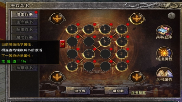 等级提升:链接的兵书等级提升,也会提升链接属性。例如,每个角的三条链接全部为2级或3级时,相应的百分比也会提升。