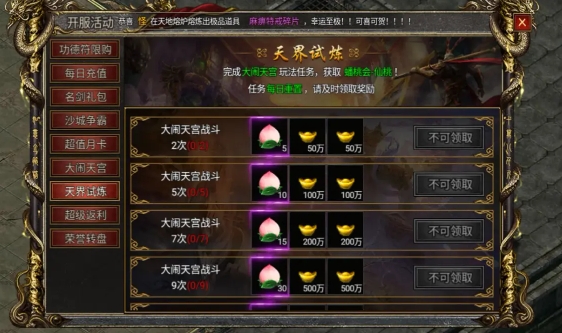 次数奖励:完成一定次数的大闹天宫玩法后,可在天界试炼中领取蟠桃、元宝等材料。