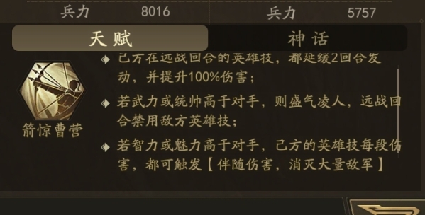 伴随伤害:如果袁绍的智力或魅力高于对手,己方英雄技每段伤害都可以触发“伴随伤害”。这意味着选用剑雨神威这种能造成多次伤害的技能,会比诱魄天玺单点爆发技能的性价比更高。