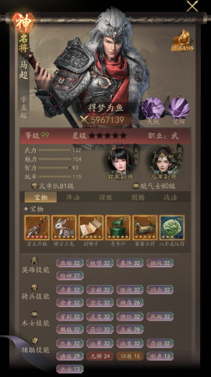 天赋的觉醒,骑兵速度提升30.为马超先手奠定基础,基础攻击40,免伤55%,骑兵免疫百分比伤害,当马超武力达到110,每回合发动奇袭,并且伤害提升到50%,基础天赋和觉醒天赋决定马超属于兵种爆发将。