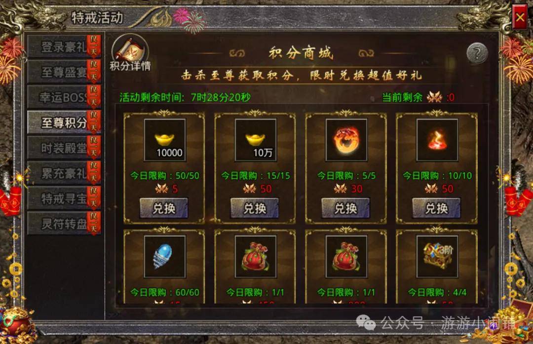 1.击杀至尊BOSS可获得对应积分,积分可在积分商城兑换道具;
