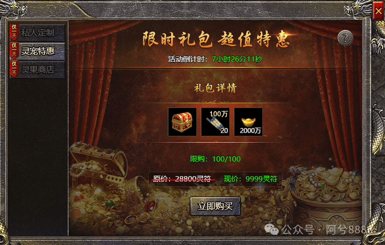 伏魔战歌逍遥合击烈焰天下折扣包服灵宠特惠活动期间限时出售灵宠礼包,开启可获得超值豪礼!概率公示: