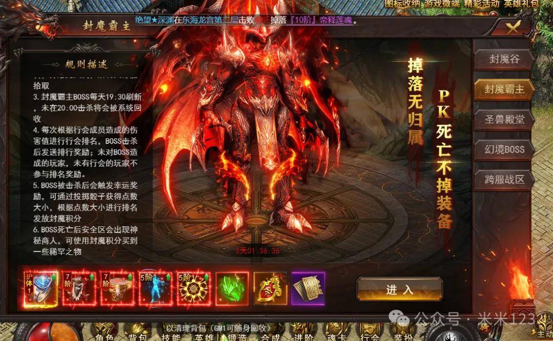 维京传奇折扣包服微变攻速传奇场景内死亡不掉落,杀人不加战意值,B0SS超高爆率掉各类珍贵材料,掉落无归属,所有人都能拾取,封魔霸主B0SS每天19:30刷新未在20:00击杀将会被系统回收。