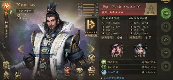 马谡的天赋技能使其在副将和主将位置上都能发挥重要作用: