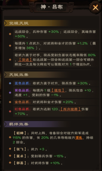 天赋增伤:吕布对武将和全才有高额增伤56%,非常罕见。觉醒天赋第一条完美契合版本环境,兵种赛季兵种伤害量的爆炸,可以配合专属技能“气如鬼神”的降防效果和神威的削buff(打掉对面固若和打草的防御)在远战回合打残对手。