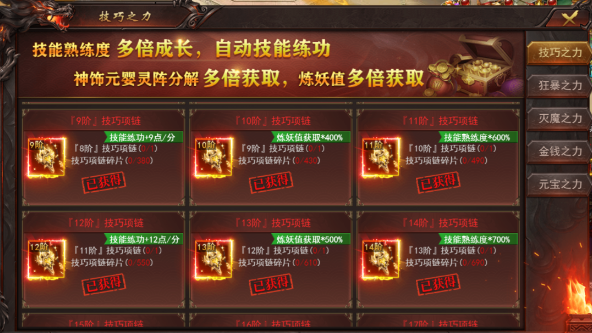 技巧项链等级越高,这些属性增加的越多,这个技巧碎片我们可以在,开服活动技巧礼包里面用钻石买到。