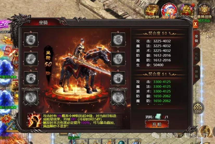 而且触发的时候本次伤害提升100%,可与暴击叠加,有一定的概率可以直接满血秒掉敌人!升级的话就用坐骑契约升级就行了。坐骑契约材料的话可以去坐骑副本击杀boss获得。