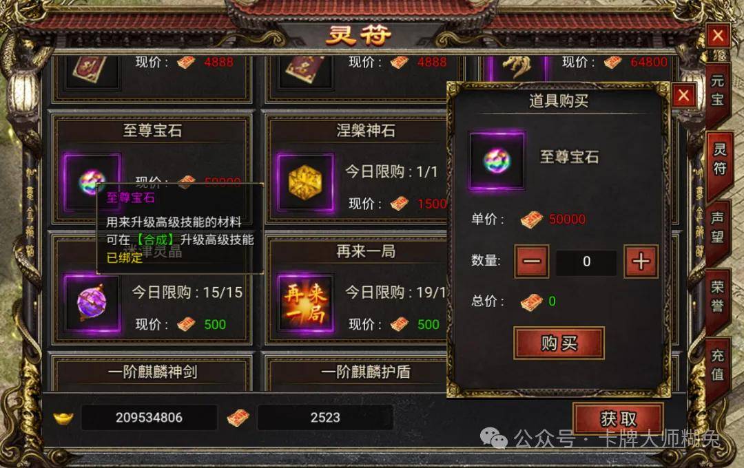 至尊宝石是游戏中合成超级神技的必须道具,在游戏中一共有三个获取方式,第一个是灵符商城长期出售的,五万灵符一颗,太贵了,不建议购买,第二个是每日充值累计天数奖励,每个月可以白嫖两颗,第三个就是等限时活动出宝石礼包,活动价格只需四万灵符一颗,最划算的就是每天充值十米拿个累计奖励,然后等活动在买~