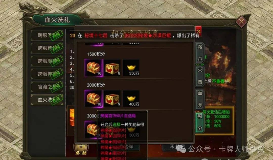 血火洗礼是游戏内大型跨服团队竞技活动,专为热爱团战、追求荣耀的老玩家量身打造,开服90天后即可参与,多个服务器的顶级战盟将被系统匹配到同一张地图,展开激烈混战,重温当年跨服争霸的热血与激情。