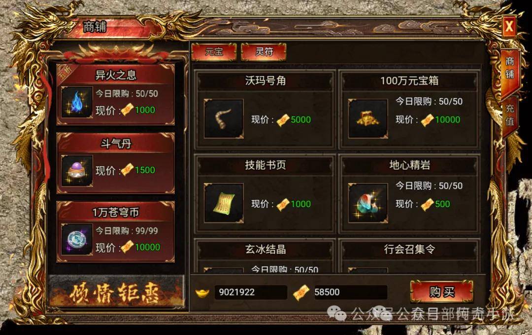 关注“开服庆典”页签:里面往往有连续七天的每日特惠礼包,第2、第3天的礼包常含折扣异火之息,看到“5折”“7折”字样,根据自己预算果断入手。
