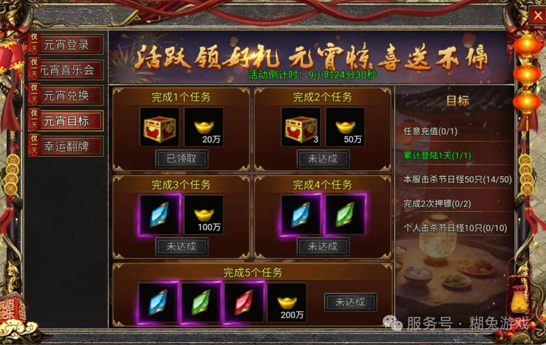 今天元宵节,活动也已经上线了,大家都看到了,并不算多,一共也就四个活动,第一个日常登录,第二个打怪掉花灯,免费兑换道具,第三个元宵目标,第四个幸运翻牌,也就这一个翻牌是需要氪金的,但是他的大奖一共就两个时装+称号,加的还是抗暴属性,没什么作用。