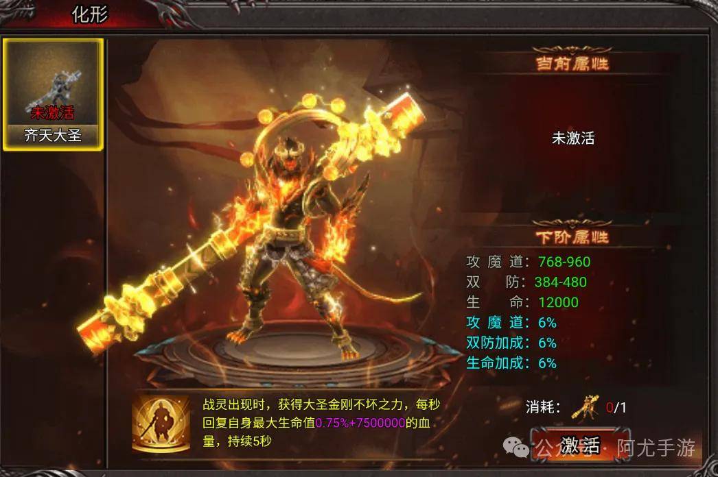 齐天大圣战灵幻化:战灵出现时,获得大圣金刚不坏之力,每秒回复自身最大生命值0.75%+7500000的血量,持续5秒