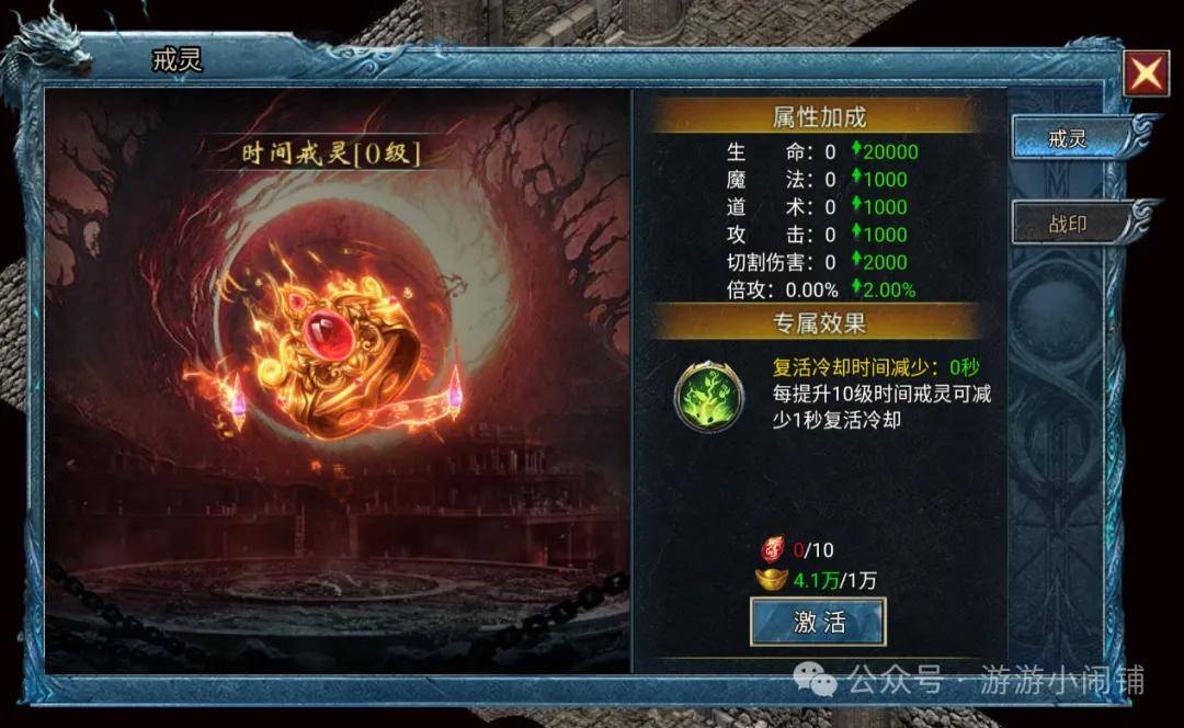 而戒灵等级,直接决定你的复活冷却时间!玩过传奇类手游的都知道,复活速度就是生存速度,尤其是前期刷BOSS、打团战,别人复活只要3秒,你要等10秒,BOSS的掉落、团战的胜局早就和你没关系了。