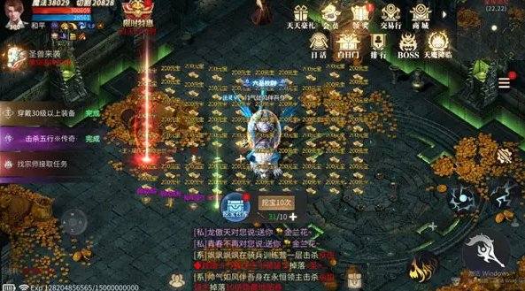 挖宝宝库支持一键操作,装备材料自动暂存,前期挖满一套高阶装备效率极高。但真正的重头戏在深层:地宫走廊是游戏最早开放剑甲类BOSS的地图,武器衣服爆率远高于野外,且自带反伤机制——攻击BOSS会反弹伤害给自己。一层反伤较弱,二层伤害明显提升,建议配备吸血神器或绑定道士队友,用吸血抵消反伤;后期拿到反噬装备后,刷起来更加轻松。