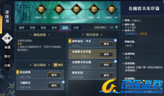 方法:玩家每天完成100日课点,每周把混江湖/帮会联赛/名捕震关东/宣和宝图这些产出游戏币的主要玩法全部做满即可;