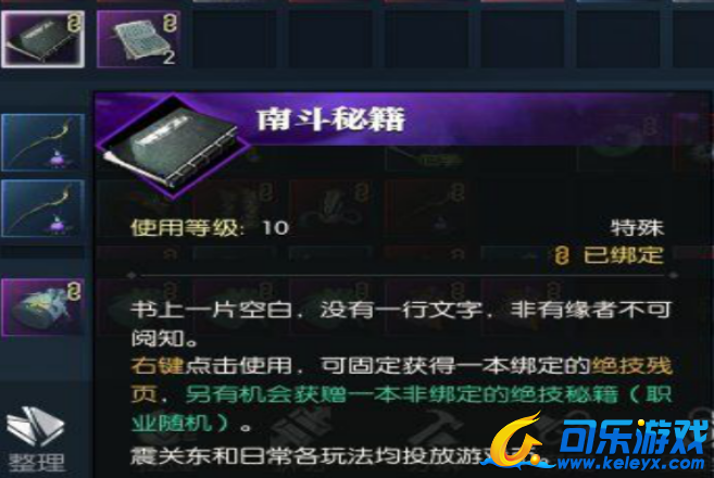 南斗秘籍比较像抽奖礼盒,使用会固定获得一本绑定的绝技残页,然后有机会获赠一本非绑定的绝技秘籍(职业随机)。