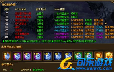 九泉之下副本进入的等级需要达到55级,这个地图是PVP地图,玩家可以在副本里自由PK。副本一共有四层,每层都有两个boss。