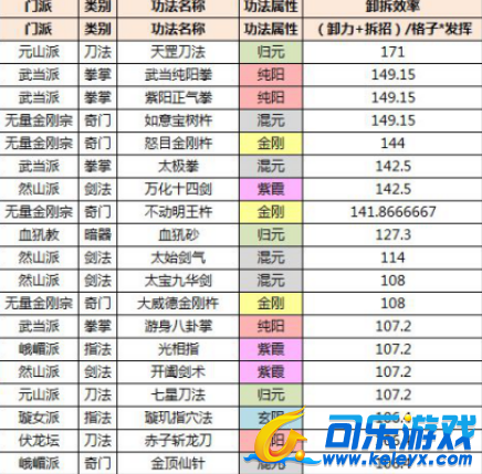 1. 主太极劲的武当适合带哪些招式(单位格子的拆卸效率),可以看出高拆卸的招式确实集中在武当和无量挨打宗。