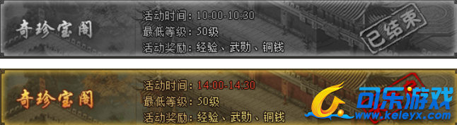 奇珍宝阁每天开启两次,上午10点-10:30开启一次,下午14:00-14:30开启一次,等级达到50级才可以进入。奇珍宝阁是一个类型属于开箱子的活动副本,箱子分青铜宝箱、白银宝箱还有黄金宝箱。宝箱等级不一样开出来的东西也是有区别的。进入奇珍宝阁活动副本后默认为势力PK模式,所以说也不仅仅是开宝箱这么简单,也是有PK成分在里面的,打不过另一方可能就抢不到箱子了,所以提升自己的战斗力还是很重要的。