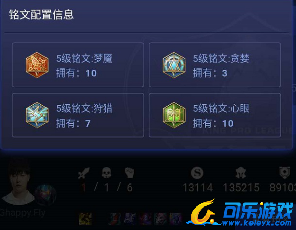 从铭文上来看,fly没用什么特别的铭文,标准的88法穿,蓝色则是带了7个狩猎和4个贪婪,些许的续航加上一些移速,能让他支援能力得到提升。
