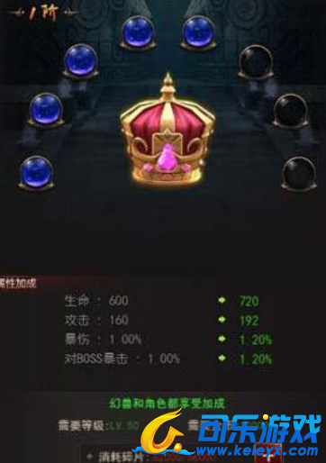 属性加成就是在中间靠左的位置了,可以看到当前提升了1%的暴击伤害和1%的对BOSS暴击几率,当然我这还是进阶的很少的。