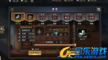 收购材料需要消耗木材、石料、铁矿3种资源,每次最多收购1种材料,收购数量上限5个,还要等待一段收购时间(不同的材料收购时间有所不同)。
