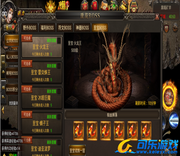 玩家点击激战BOSS按钮即可找到至宝BOSS界面,有至宝火龙王、至宝蝎子王、至宝灭世屠夫、至宝雷炎蛛王、至宝冰眼巨魔等。这些BOSS刷新时间和地点不一样,你可以看到当前你能击杀的BOSS,每个BOSS玩家都可以挑战5次。