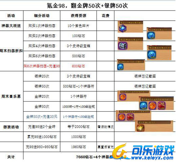 氪金30:那么金砖2000砖石就木有了,当然可以选择不翻银牌,可以省去近2000砖石吧。银牌主要是紫色的神器,至于我为什么要翻,还是为了拿个神器符和进阶石、凑消费罢了。