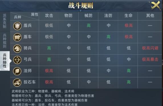 乱世纷争中的兵种包括盾兵、盾车、骑兵、弓兵、法师、投石车,其中盾兵与盾车拥有极高的生命,骑兵拥有极高的闪避,弓兵拥有极高的暴击,法师与投石车拥有极高的攻击。玩家在布阵时,可以运用这些特性合理安排前后排的兵种。