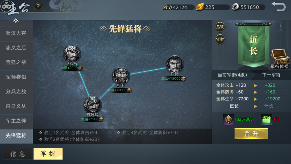 在军衔界面中,有许多激活武将的组合例如“初出茅庐”组中包括将领关平、婵儿、潘凤、蔡文姬、貂蝉、徐庶,“江东四杰”组合中包括将领吕蒙、陆逊、鲁肃、周瑜,“江表虎臣”组合中包括周泰、程普、凌统、黄盖、徐盛、甘宁,“先锋猛将”中包括将领张辽、夏侯淳、典韦、许诸,除此之外,还有多种将领组合,激活每一位或一组将领,都会获得军功奖励,用以提升军衔。