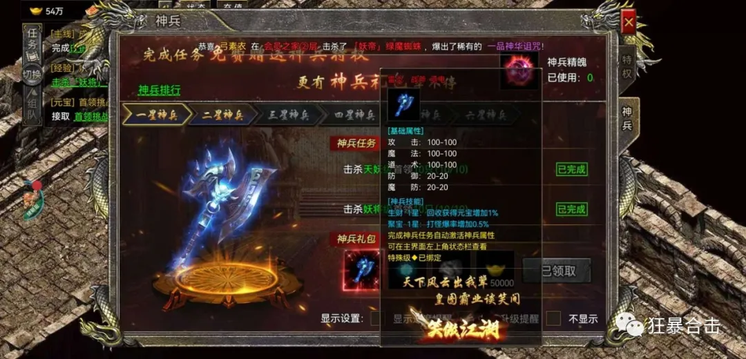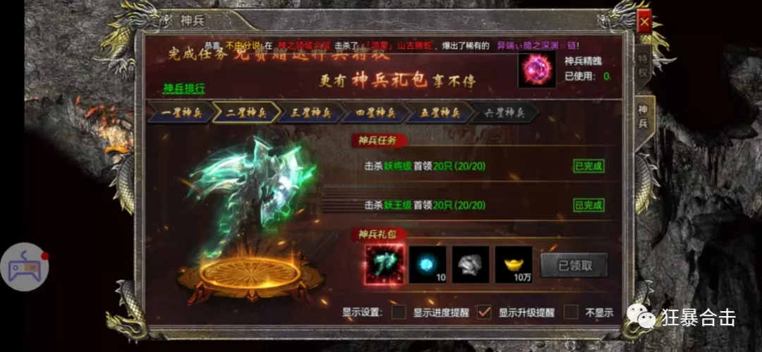 神兵系统是一个不需要充值也能升级的系统,只要杀到一定数量的怪就可以升级,升级神兵可以增加回收元宝是数量和爆率,这就比原本的怒火一刀多了一条可以提升爆率的办法了,升级神兵还可以获得阵法之灵、称号、玉佩碎片等等奖励。