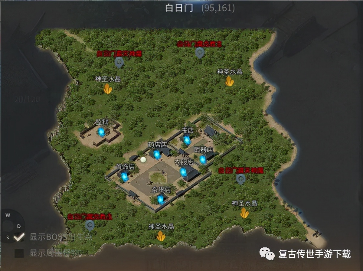 白日门猎魔为击杀BOSS玩法,每日11:00-22:00开始,白日门地图上会固定刷新4只BOSS,分为两只白日门魔龙教主和两只白日门震天神魔,我们从前面的地图中也可以看到。