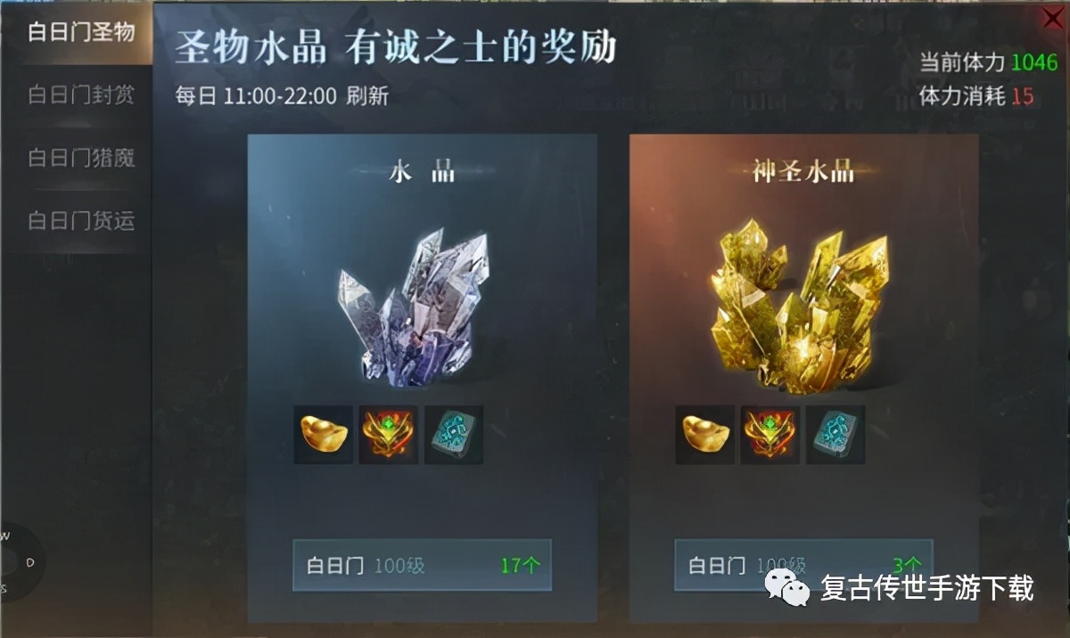 白日门圣物玩法刷新时间为每日11:00-22:00,分为水晶和神圣水晶。