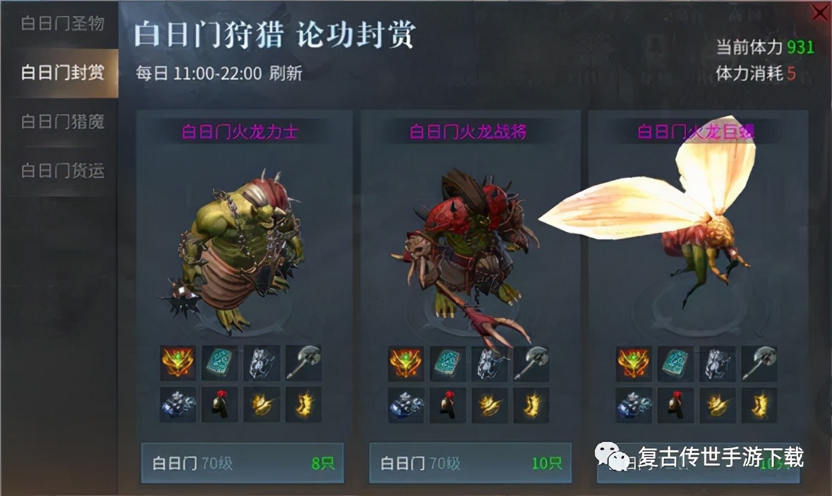 白日门封赏主要为击杀白日门的三类精英怪:白日门火龙力士、白日门火龙战将、白日门火龙巨蛾,死亡后一定时间随机刷新在地图上。