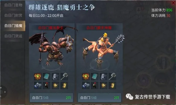 同样是每日11:00-22:00开启刷新,单次击杀怪物消耗5点体力,体力值不够时击杀不会掉落奖励。