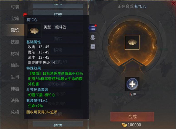 下面来说说获取方式吧。首先斗笠和护盾都属于配饰,高级的斗笠和配饰都需要玩家凑齐对应个数的低阶版本来进行合成,而最低阶的斗笠需要10斗笠币合成,同样,护盾需要的材料为盾牌币,两种材料掉落范围相同:第二大陆怪物、280级以上BOSS。