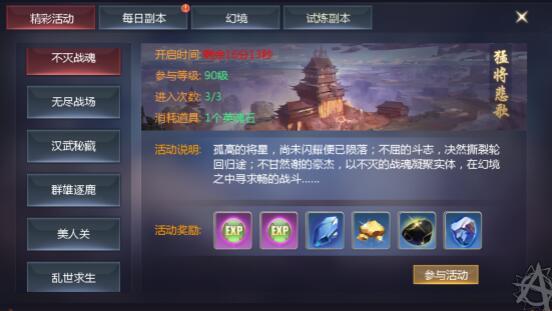 在活动开启时间点后,有两分钟的报名时间,报名时间内可进入活动地图参与活动。进入活动需消耗一个道具”英魂石”,可通过副本掉落。每天每个玩家可参与3次,次数用完则不可进入。