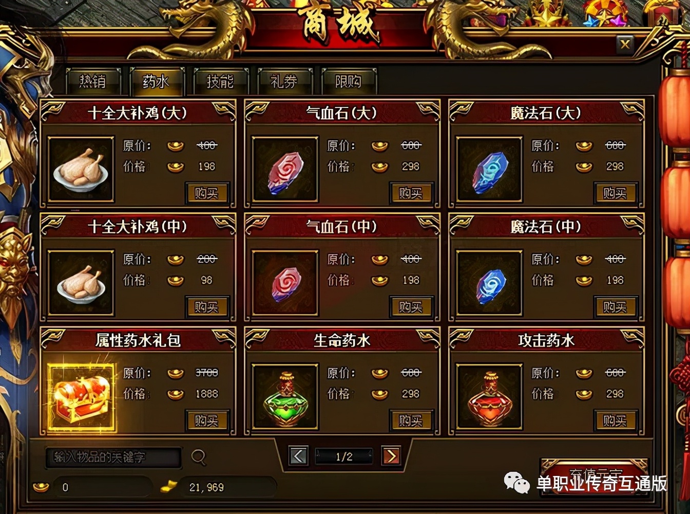 对于平民玩家而言,使用礼券、绑金在随身商店购买一些药水也是一个不错的方法。随身商店有十全大补鸡(小)、万年雪霜、万年雪霜包、太阳水、太阳水包、气血石(小)、魔法师(小)等等。