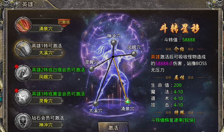 斗转系统中分为五个穴位,在我们达到一定的等级或者转生的时候就可以激活穴位了,也可以通过激活会员来激活穴位哦。