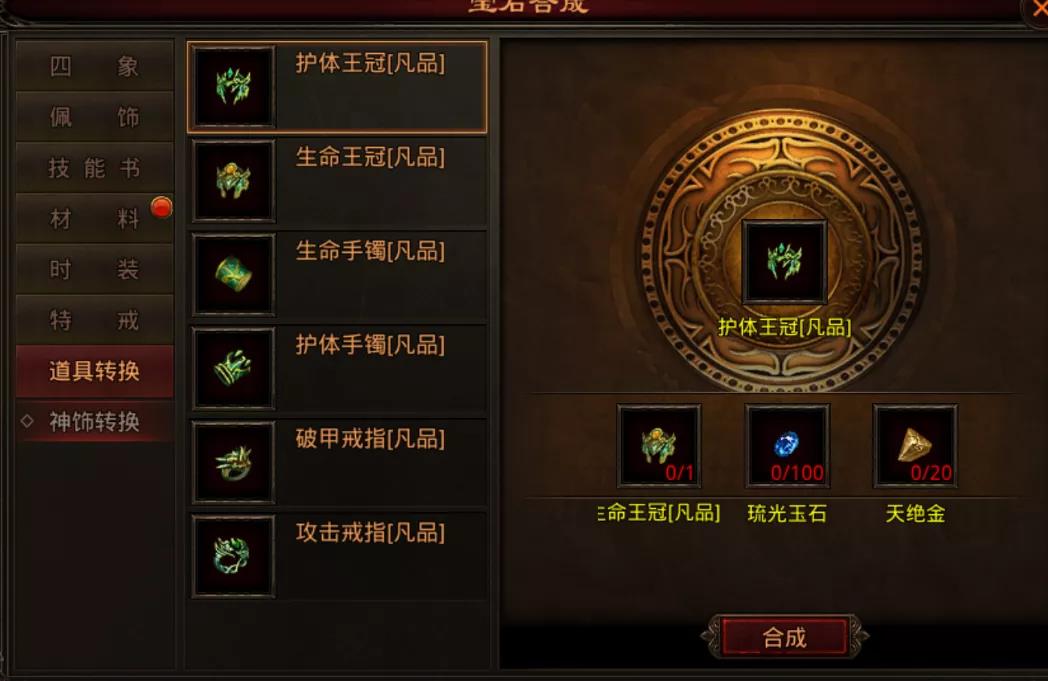 可以看到,除了琉光玉石之外,我们想要合成高级材料和极品装备还需要天地金和其他的道具,所以我们想要哪件装备或者哪个材料,可以先看下需要的道具,然后准备起来。
