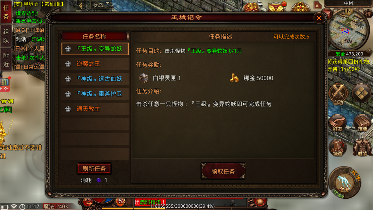 在领取到王城诏令任务后,就可以根据任务提示,前往寻找指定的BOSS击杀,即可完成任务获得丰厚的绑金奖励和相应数量的白银灵匣奖励。每位玩家每天可以完成6次王城诏令任务,任务次数每天24时刷新,大家就不要错过每天的任务次数哟。