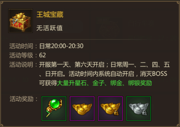 王城宝藏的活动也不是任何时间都开放的,开放时间是每周一、周二、周四、周五和周日的20:00-20:30,想要参加的小伙伴们可不要错过哦。