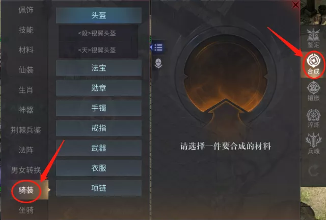 在骑装合成中,头盔/法宝/勋章/手镯/戒指的合成需要用到坐骑驯化石,项链/武器/衣服需要用到坐骑神石。