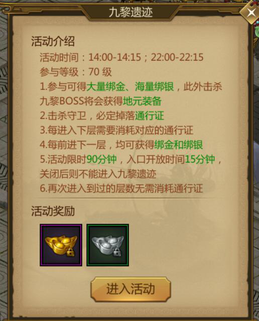 我们参与活动可以获得大量的绑金,绑银,击杀九黎boss还可以获得地元装备。这是地元装备的主要获取途径之一,所以想要地元装备的小伙伴们最好是参加九黎遗迹活动哦。
