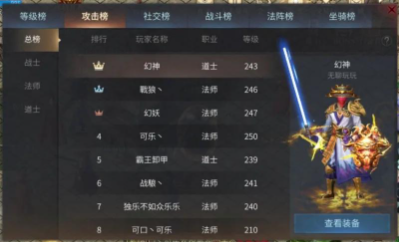 排行榜系统分为六个榜,分别是:等级榜、攻击榜、社交榜、战斗榜、法阵榜和坐骑榜。每个排行榜都有独立的排行。