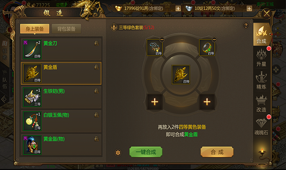 【合成】一件装备与背包中四件品质、等级段相同的装备进行合成,可以提升品质。装备品质最高可以提升到绿色,绿色装备有几率获得特殊效果哦。