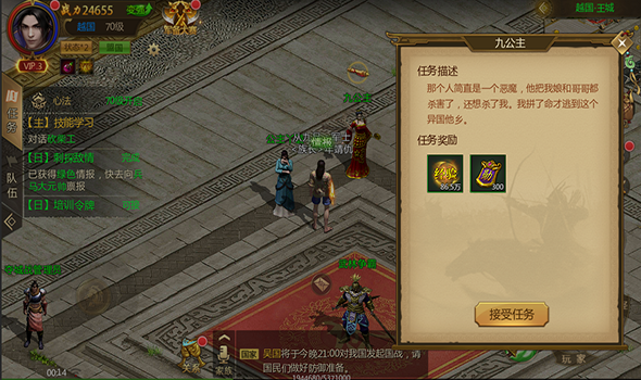 我们每天可以在本国九公主处接取暗杀太子任务,前往敌国王国击杀敌国太子!然后领取奖励哦。