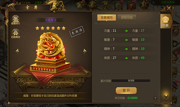 功勋值积累满是即可在皇帝处加官进爵,获得更高的官爵属性,以及其他获得大量属性哦。